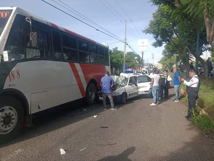 Morelia, Michoacán a 24 de agosto 2023.- La mañana de este jueves se registró un accidente de tránsito entre un taxi de la base Villas del Pedregal y un camión del transporte público de la ruta Villas del Pedregal, en el lugar se registran lesionados.