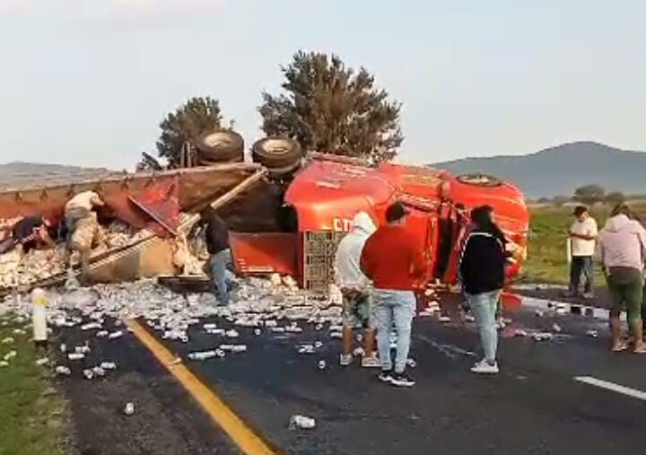 Ecuandureo, Michoacán, a 10 de agosto de 2023.— Un tráiler cargado con varias toneladas de cervezas, volcó este jueves sobre la autopista de Occidente México – Guadalajara, el operador de la unidad resultó lesionado.