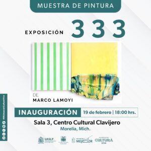 Por su parte, la Sala 3 albergará “333”, exposición del artista contemporáneo Marco Lamoyi, considerada una antología visual que abarca pintura y fotografía. Lamoyi es reconocido como uno de los impulsores del postmodernismo en México y en su obra explora conceptos como la tridimensionalidad, el espacio y la idea como esencia creativa. Esta exposición ya fue presentada anteriormente en la Universidad Autónoma de San Luis Potosí.