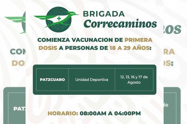 Serán los días 12,13,16 y 17 de agosto del presente año en la Unidad Deportiva de Pátzcuaro con un horario de 8:00 a las 16:00 horas, el biológico que les será administrado será del laboratorio Aztrazeneca primera dosis.