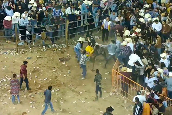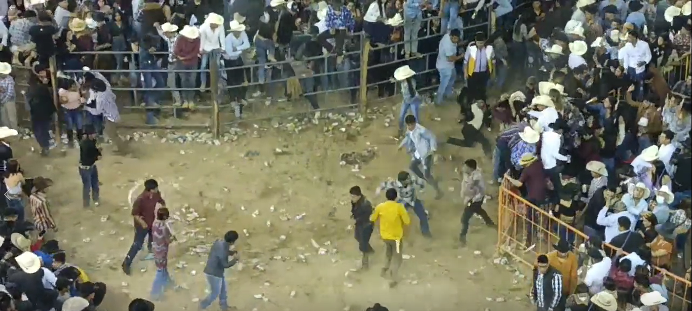 En los videos se puede observar justo el momento de la pelea que se situó en medio del ruedo y como también aventaban vasos de cerveza mientras quienes desataron la riña seguían golpeándose.