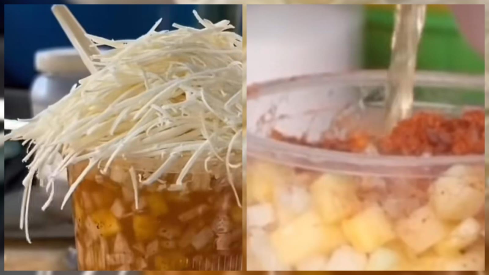 Los ingredientes son hechos casi de la misma forma que el gaspacho, y es que lleva su respectiva fruta, jicama, pepino y cebollita con su queso, donde por supuesto no puede faltar el chilito en polvo con limoncito, pero lo peculiar es el jugo que se le pone, ya que es vinagre de piña.